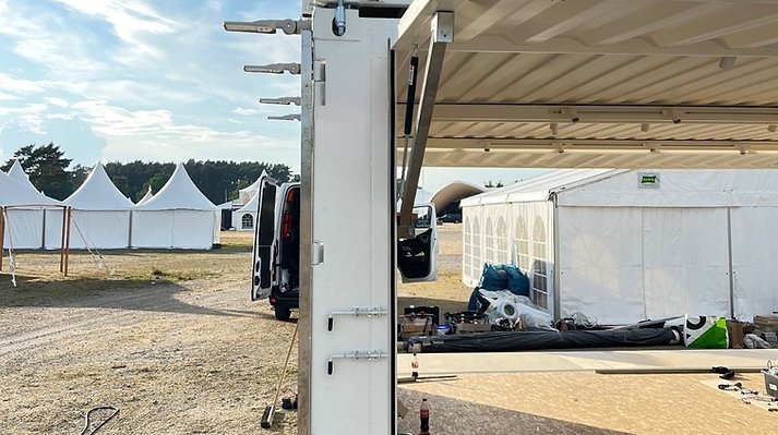 – Mécanisme d’ouverture des parois latérales : Les parois latérales du conteneur s’ouvrent grâce à des actionneurs électriques télécommandés, offrant un espace couvert supplémentaire de 15 m², idéal pour accueillir plus de participants ou exposer des équipements lors d’un événement.